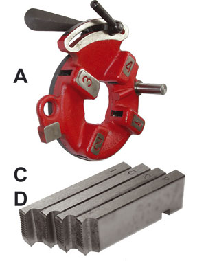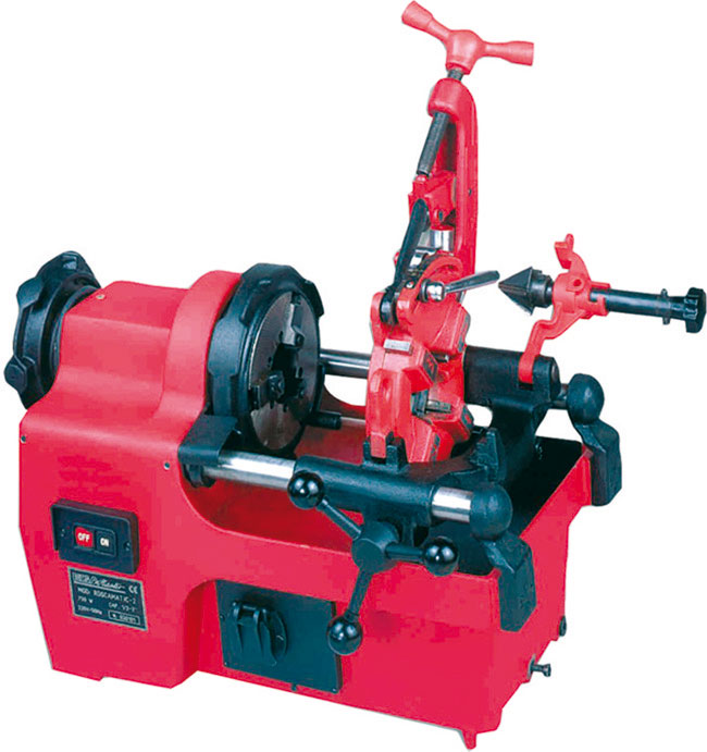 Per filettature DESTRE di tubi da 1/4" a 2" BSPT e barre da mm 10 a 52. Tipo a banco, professionale e potente. Motore a condensatore a 750 Watt, monofase Volt 220 Hz 50, molto silenzioso. Con lubrificazione automatica, filettatura a tubo rotante. Velocità 28 giri/min. Peso kg 65.