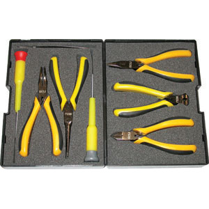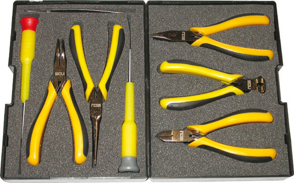 Assortimento in cofanetto di plastica dura. Contenuto di 8 pezzi. Composizione: 1 pinza Art. 92 GE 1 pinza Art. 92 GL 1 pinza Art. 92 GP 1 tronchese Art. 551 G 3 1 tronchese Art. 551 G 7 1 pinzetta per elettronica punte sottili mm 115 1 giravite per elettronica punta a taglio mm 50x2 1 giravite per elettronica punta a croce PH 00