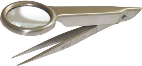 Corpo snodato completamente in acciaio INOX.Pinzetta a punte sottili piatte lisce, lunghezza mm 80. Diametro lente mm 25.Ingrandimenti 5x.
