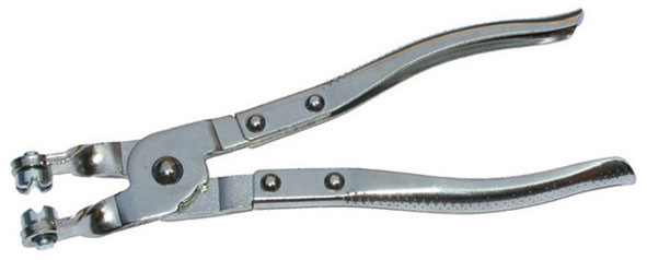 In robusta lamiera d'acciaio. Tipo per anelli a molla con sezione tonda semplice. Ganasce con tasselli girevoli a 360° provviste di incavi per l'introduzione delle estremità degli anelli anche in posizioni di difficile accesso.