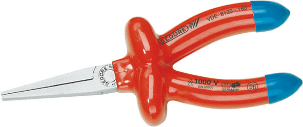 Utensili a isolamento fino a Volt 1000 con marchio di prova VDE - EN 60900.PINZE A BECCHI PIATTI DIRITTIIn acciaio speciale temprato a olio. Becchi lunghi finemente zigrinati.Esecuzione cromata.