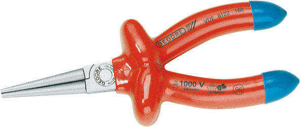 Utensili a isolamento fino a Volt 1000 con marchio di prova VDE - EN 60900.PINZE A BECCHI TONDI DIRITTIIn acciaio speciale temprato a olio.Becchi lunghi finemente zigrinati. Esecuzione cromata.