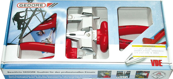 Assortimento di pinze e tronchese, teste cromate. Isolamento per immersione.Composizione di 3 pezzi:1 pinza Art. 352 GE x 1601 pinza Art. 352 GN x 1801 tronchese Art. 352 GT x 160In scatola di cartone.