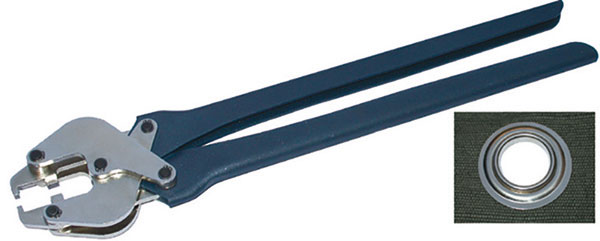 Tipo per occhielli giganti a grande capacità di pressione (1 Ton. circa). Modello brevettato, a doppia leva, per ridurre lo sforzo d'uso. Chiusura parallela delle ganasce con punzoni e matrici intercambiabili. Testa in acciaio temprato e impugnatura in robusta lamiera. Ideale per teloni, coperte, vele ecc. di forte spessore e robustezza.