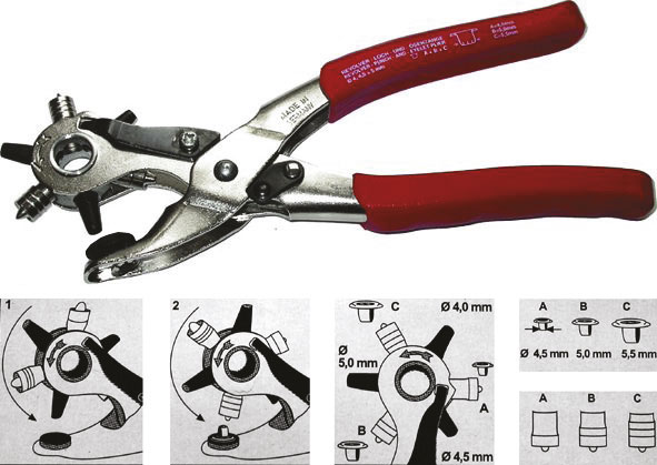 Tipo in robusta lamiera d'acciaio. Con tamburo a 3 fustelle per preforare da mm 4-4,5-5 e 3 punzoni per serrarre occhielli Ø esterno mm 4,5-5-5,5.Esecuzione nichelata e impugnature ergonomiche in materiale sintetico. Con molla.
