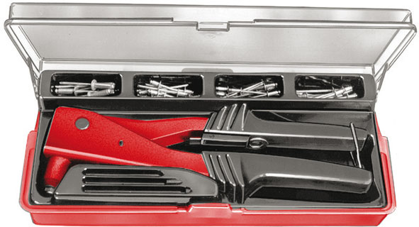 Assortimento di circa 75 rivetti in alluminio da Ø mm 3 a 4,8 assortiti e pinza Art. 498.