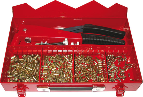 Assortimento di circa 400 inserti filettati in acciaio a testa piana da M 3 a 6 assortiti e pinza Art. 514 C.