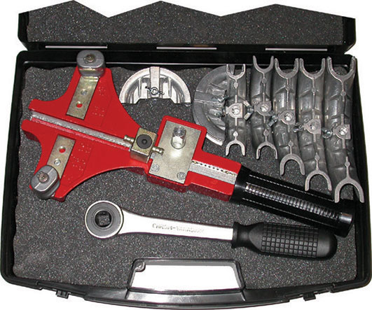 Tipo con avanzamento e trazione meccanica, comandato da un riduttore a cricchetto. Non adatti per tubi in acciaio sottile. Di facile trasportabilità, rende agevoli le curvature su impianti in opera. Fornito di matrici adatte per piegare tubi di alluminio, ottone, rame ricotto da Ø mm 10 a 22. Contromatrici regolabili per tutte le misure.