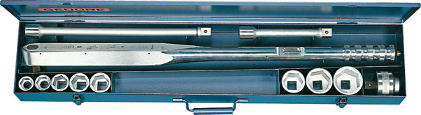Composizione:1 chiave dinamometrica 795 G 271 bussola a cricchetto8 bussole esagonali da mm 22-24-27-30-32-36-41-462 prolunghe da mm 200 e 400
