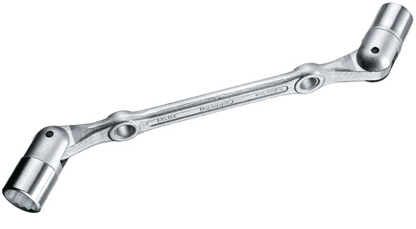 In acciaio al CROMO - VANADIO. Con due bussole poligonali snodate e foro per uso a leva. Finitura accurata. Esecuzione cromata. Per leve ved. Art. 902 G.