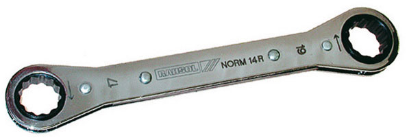 In robusta lamiera d'acciaio rinforzata. Per uso destro e sinistro. Con due bocche poligonali. Movimento fine a cricco. Finitura accurata. Esecuzione cromata.