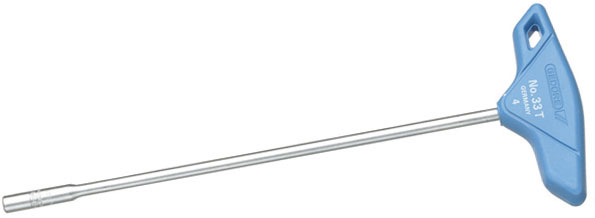 In acciaio al CROMO-VANADIO. Con bocca esagonale profonda mm 25, adatta anche per dadi incassati. Esecuzione cromata opaca. Impugnatura in plastica, con foro.