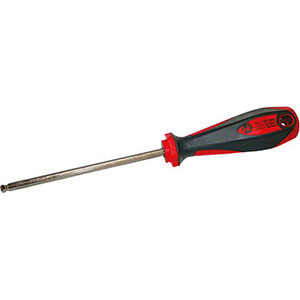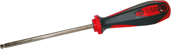 In acciaio al CROMO-VANADIO. Tipo con testa a sfera per uso inclinato fino a 30°. Impugnatura a giravite in materiale bicomponente con foro, lama nichelata.