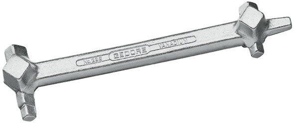 In acciaio al CROMO-VANADIO, temprato. Con 5 tasselli quadri da mm 8,7 - 9,5 - 10,5 - 11,5 - 13, 4 tasselli quadri conici da mm 6,8 a 8,7 - 10,5 a 13 - 15,2 a 18 - 16,5 a 19 e 1 lama a taglio mm 18x5,5. Per uso sui tappi dell’olio a quadro incassato e per i tappi di fusti e bidoni. Esecuzione cromata. Lunghezza totale mm 220.
