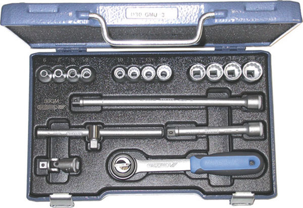 Contenuto 17 utensili. Composizione: 12 bussole poligonali Art. 952 RB mm 6 - 7 - 8 - 9 - 10 - 11 - 13 - 14 - 15 - 16 - 17 - 19 1 leva a cricco con disco, Art. 953 S mm 200 1 leva scorrevole Art. 953 H mm 160 1 prolunga Art. 953 E mm 125 1 prolunga Art. 953 F mm 250 1 snodo a cardano Art. 953 I Assortimento completo.