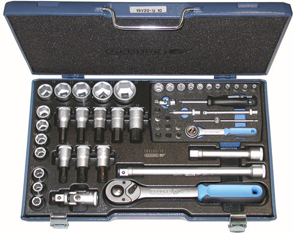 Contenuto 50 utensili. Composizione: 1 leva a cricco att. 1/2" con levetta, sgancio rapido, Art. 970 RT mm 270 12 bussole esagonali att. 1/2" Art. 969 RA mm 10 - 11 - 12 - 13 - 14 - 15 - 17 - 19 - 22 - 24 - 27 - 30 1 prolunga att. 1/2" Art. 970 RF mm 125 1 prolunga att. 1/2" Art. 970 RF mm 250 1 snodo a cardano att. 1/2" Art. 970 RI 5 bussole con esag. esterno att. 1/2" Art. 969 RV mm 7 - 8 - 10 - 12 - 14 2 bussole giravite taglio diritto att. 1/2" Art. 969 RD mm 8 - 10 1 bussola giravite a croce PH att. 1/2" Art. 969 RF 3 11 bussole esagonali att.1/4" Art. 941 RA mm 4 - 4,5 - 5 - 5,5 - 6 - 7 - 8 - 9 - 10 - 11 - 13 1 leva a cricco att. 1/4" con disco, Art. 942 T mm 127, 1 leva scorrevole att. 1/4" Art 942 G 1 prolunga att. 1/4" Art. 942 E mm 50 1 prolunga att. 1/4" Art. 942 E mm 100 1 snodo a cardano att. 1/4" Art. 942 H 1 asta portabussole con manico in plastica att. 1/4" Art. 942 P 4 bussole con esagono esterno att. 1/4" Art. 941 RF mm 3 - 4 - 5 - 6 3 bussole giravite taglio diritto att. 1/4" Art. 941 RB mm 4 - 5,5 - 6,5 2 bussole giravite a croce PH att. 1/4" Art. 941 RC 1 - 2 Assortimento completo.