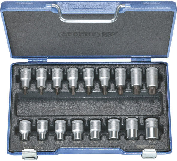 Per viti con impronta interna/esterna TORX. Contenuto 17 utensili.Composizione:9 bussole Art. 969 RS 20 - 25 - 27 - 30 - 40 - 45 - 50 - 55 - 608 bussole Art. 969 RT 1 - 10 - 11 - 12 - 14 - 16 - 18 - 20 - 24In cassetta.Assortimento completo.