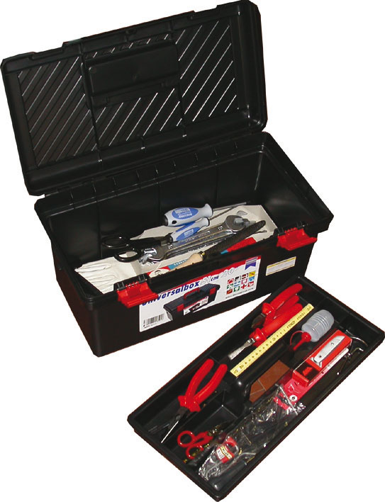 53 utensili in baule in polipropilene Art. 2085 R: 12 chiavi in serie Art. 872 GD da mm 6x7 8x9 10x11 12x13 14x15 16x17 18x19 20x22 21x23 24x27 25x28 30x32 9 chiavi in serie Art. 914 GC/9 da mm 1,5 2 2,5 3 4 5 6 8 10 1 pinza universale Art. 332 GE da mm 180 1 pinza a becchi mezzotondi Art. 250 GE da mm 200 1 tronchese Art. 569 GE da mm 160 1 pinza regolabile Art. 365 GE 240 1 forbice Art. 656 A 1 giravite Art. 1970 GA da mm 100 1 giravite Art. 1970 GE da mm 150 1 giravite Art. 1970 GP - PH 1 1 giravite Art. 1970 GP - PH 2 1 giravite cercafase Art. 1907 GA 1 martello Art. 2702 F da g 300 1 coltello Art. 662 1 doppiometro Art. 4141 1 seghetto Art. 2642 1 dz. lame Art. 2643 GA 1 coltello Art. 5231 G 1 tenaglia Art. 626 G da mm 180 1 pinzetta Art. 146 P da mm 160 1 trivelllino Art. 4540 G da mm 5 1 punteruolo Art. 2998 G 6 lime in serie Art. 2349 G da poll. 8 1 paio guanti Art. 3398 R 8 1 raspa Art. 2442 da poll. 8 1/2D 1 manico Art. 2448x120 1 scalpello Art. 2935 GA da mm 250 1 oliatore Art. 3407 P 1 cesoia Art. 672 Gx200 Assortimento completo.