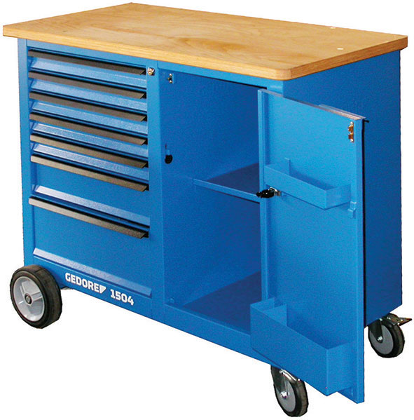 Banco mobile di notevole altezza con robusta struttura in acciaio, con verniciatura epossidica extra-resistente. Pianale in legno stratificato di forte spessore, che evita nel modo più completo le eventuali deformazioni del legno. Provvisto di cassetti scorrevoli con fermo a fine corsa, chiusura singola e chiusura centrale. 4 ruote gommate di cui 2 piroettanti provviste di freno per un'immobilità assoluta. Possibilità di fissaggio di una morsa sul pianale di legno.