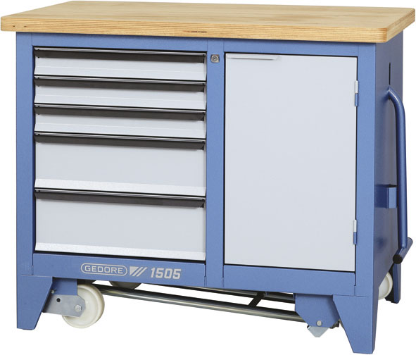 Banco mobile con robusta struttura in acciaio, con verniciatura epossidica extra-resistente. Pianale in legno stratificato di forte spessore, che evita nel modo più completo le eventuali deformazioni del legno. Munito di 4 ruote retrattili per agevoli e sicurissimi spostamenti nonchè per un perfetto stazionamento fisso. Uno speciale meccanismo di comodo azionamento mediante la leva di traino provvede alla trasformazione. Chiusura singola e chiusura centrale.