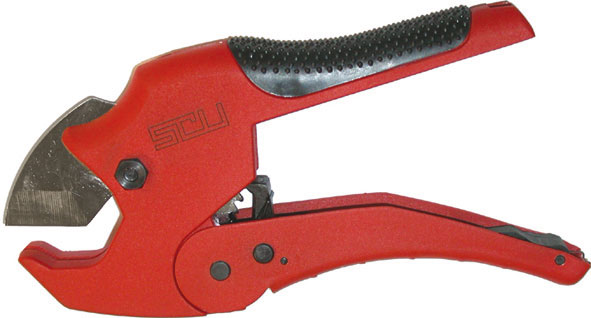 Tipo professionale a cesoia, con movimento a cricco e profilo della lama speciale per un agevole taglio di ogni tipo di tubo in PVC, PE, PP, PB, VPE, PVDF, Nylon, gomma, vinile fino a Ø mm 42. Taglia anche canaline di plastica fino a mm 15x30 e cavi elettrici fino a Ø mm 12 (sezione max 4x2,5 mm^2).