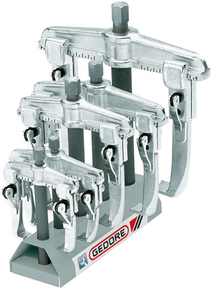 Composto di cinque estrattori Art. 1425 GR su robusto supporto in lamiera, da esposizione e da officina.Apertura estrattori: mm 90 - 130 - 160 - 200 - 250.