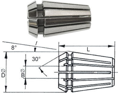 Gr. 8. Con capacità elastica di serraggio di mm 0,5. Dimensioni (mm) D = 8,5 L = 13,6.
