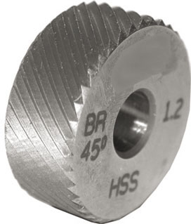 Tipo professionale secondo norme DIN 403 per godronature a DEFORMAZIONE secondo DIN 82. Diametro mm 20. Spessore mm 8. Foro mm 6. In acciaio SUPER-RAPIDO HSS speciale, durezza HRc 62 (± 1). Facce laterali e fori rettificati. Fresatura fine dei denti.