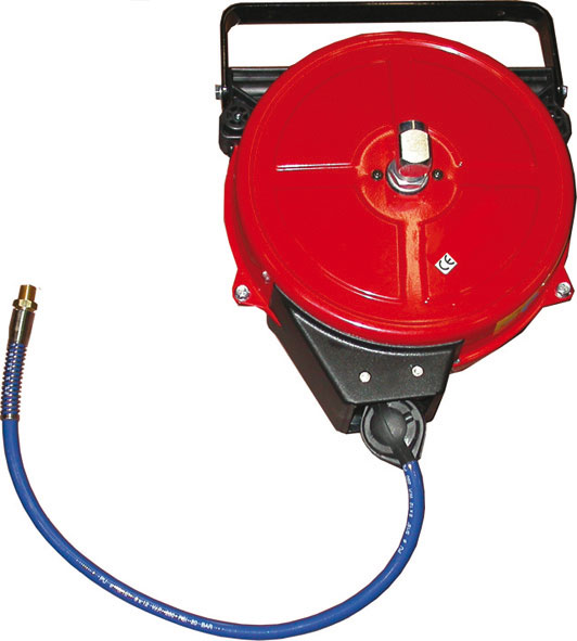 Tipo industriale, chiuso, solo per aria, in lamiera d'acciaio stampata e verniciata con polvere epossidica per la massima protezione. Avvolgimento automatico del tubo con possibilità di fermarlo alla lunghezza desiderata. Supporto a muro girevole per un ottimale orientamento. Tubo in poliuretano rinforzato con treccia tessile per una pressione d'uso fino a 20 bar, lunghezza m 12, Ø mm 8/12. Attacco entrata aria G. 3/8 F, attacco uscita aria G. 1/4 M. Peso kg 6.