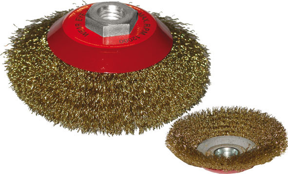 Tipo a disco conico con fili d’acciaio ottonato (solo Ø mm 150 in acciaio fosfatato), ondulati, Ø fili mm 0,30. Con foro filettato M14.