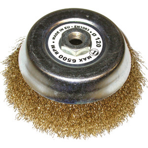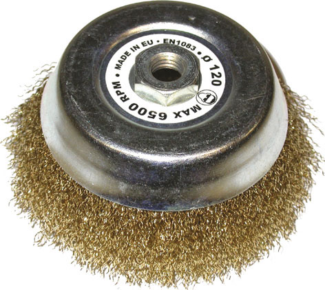 Tipo a tazza con fili d’acciaio ottonato (solo Ø mm 150 in acciaio fosfatato), ondulati. Con foro filettato M14.
