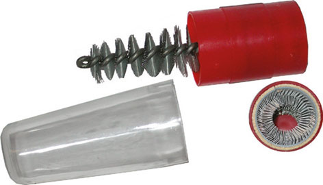 Tipo combinato per pulire terminali batterie.Da un lato con scovolo conico, dall’altro con spazzola a fili interni. Impugnatura in plastica con coperchio.