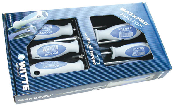 Giraviti, linea professionale per elevate prestazioni, con impugnatura anatomica triangolare antiscivolo, ottenuta mediante la combinazione di materiali plastici rigidi e morbidi. Lame in acciaio CROMO-VANADIO EXTRA, altamente legato, al silicio, con misure riportate. Esecuzione cromata opaca, punta nera di alta precisione. Con foro di aggancio.