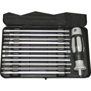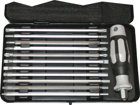 Composizione di 12 pezzi: 1 impugnatura 1 lama taglio diritto mm 4/6 1 lama taglio diritto mm 5,5/6,5 1 lama taglio a croce PH 1/PH 2 1 lama taglio a croce PZD 1/PZD 2 1 lama per esag. mm 3/a sfera mm 3 1 lama per esag. mm 4/a sfera mm 4 1 lama per esag. mm 5/a sfera mm 5 1 lama per esag. mm 6/a sfera mm 6 1 lama impronta TORX T 10/T 15 1 lama impronta TORX T 20/T 25 1 lama impronta TORX T 30/T 40 L'assortimento completo.
