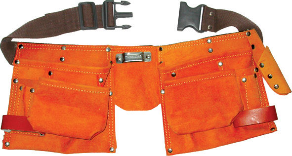 In crosta bovina. Cuciture e borchie di rinforzo. A tasche multiple per chiodi, minuterie, martello, pinza, tenaglia, 2 ganci laterali in cuoio e supporto centrale. Con cintura in tessuto nylon, regolabile. Ideale per carpentieri, manutentori, edili, falegnami ecc.