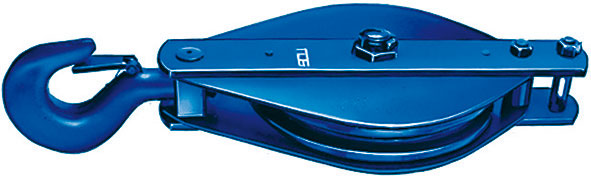 Per funi in acciaio. - Montate su cuscinetti a sfere.Esecuzione robusta con gancio in acciaio forgiato e fermo di sicurezza.Rotelle in acciaio, ricavate dal pieno. Alta resistenza.