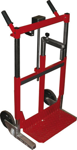 Tipo per il trasporto di oggetti vari e con l'apposito gancio, per il trasporto e posizionamento preciso di radiatori. In robusto profilato quadro d'acciaio, impugnature in gomma, meccanismo di sollevamento a manovella, 2 ruote in gomma di grandi dimensioni più 2 coppie di ruote piccole per il movimento trasversale del carrello. Altezza massima mm 930, larghezza mm 550, peso kg 18, portata massima kg 250.