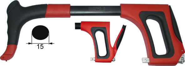 Tipo industriale, fisso, robustissimo, rigido, ergonomico, in doppia fusione di alluminio. Impugnatura e appoggiamano rivestiti in gomma morbida per rendere la presa piu' efficace e comoda. Regolazione della tensione della lama mediante rotellina godronata, che fissa inizialmente la tensione desiderata. Bloccaggio/sbloccaggio rapido a leva posta nell'impugnatura per le successive operazioni di sostituzione della lama. Possibilita' di tagli a 45°/90° rapidi e precisi.