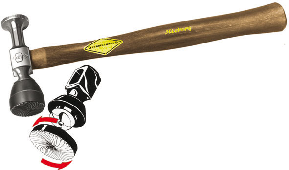 In acciaio SPEZIAL-STAHL. Manico in legno Hickory. Per lamiere di carrozzerie che risultando stirate debbano riacquistare la superficie originale. La percussione e la rotazione combinate ottengono lo scopo di ristabilire le tensioni originali della lamiera. Per spessori di materiale da mm 0.2 a mm 1. Con una testa tonda rotante Ø mm 42 e una tonda Ø mm 31.5 lucida.