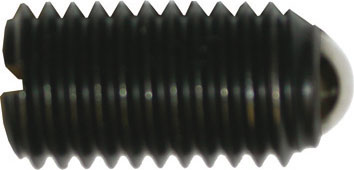 Tipo con sfera, intaglio a giravite e spinta maggiorata. In acciaio temprato, classe di resistenza 5,8, bruniti. Sfera temprata.