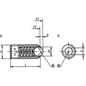 Note | Cod. Art. | Cad. | Cod. Prod. | Filett. Ø D M. | Forza min F1 N | Forza max F2 N | Ø sfera D1 mm | Lungh. pressore L mm | Sporgenza sfera H mm | Misura esag. S mm | Peso c.ca grammi | Giacenza | Peso Art | QTAMIN |