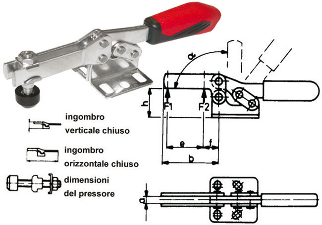 Dispositivi di serraggio sicuri e costanti di elevata qualità. Funzionamento a doppia leva, che non permette lo sganciamento in fase di tenuta. In acciaio inossidabile con impugnatura resistente agli olii e agli acidi, con bussole di supporto temprate e rettificate. Completi di vite e puntale in resistente gomma dura. Indicati per industrie chimiche, alimentari, dove occorrono speciali condizioni igieniche, dove l’utilizzo è critico a causa delle sfavorevoli condizioni climatiche, dove si utilizzano liquidi di raffreddamento particolarmente aggressivi. Forza min. e max (F1-F2) espressa in Newton (N).