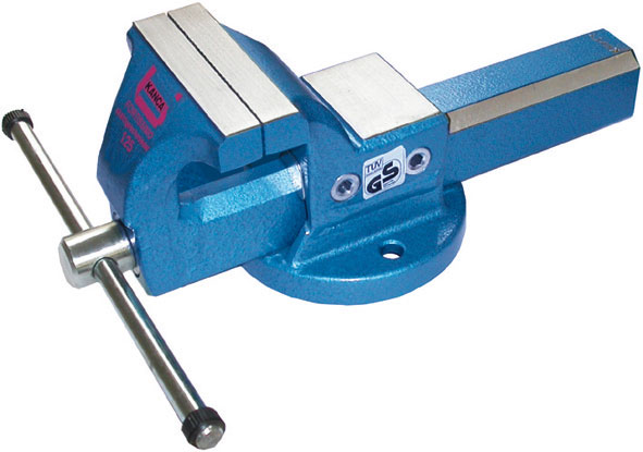 Tipo fisso. Morsa parallela con incudine. Esecuzione interamente in acciaio forgiato. Indistruttibile, a ganasce fresate e piani di serraggio trattati con tempra supplementare. Incudine con ampio piano di lavoro trattato con tempra supplementare. Guida di precisione con regolazione laterale che mantiene un perfetto centraggio ed uno scorrimento parallelo delle ganasce. Dotata di ganasce fisse per tubi.