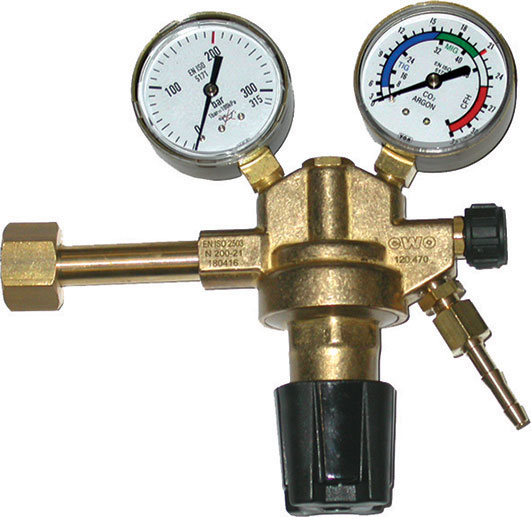 Tipo COMBINATO PER ARGON E ANIDRIDE CARBONICA. Corpo stampato in ottone massiccio. Manometri di precisione. Manopola di regolazione della pressione in materiale sintetico e regolazione supplementare del passaggio del gas. Attacco filettato internamente, destro mm 21,8x14 filetti per pollice. Attacco filettato porta-gomma G 1/4. Diametro porta-gomma mm 6.