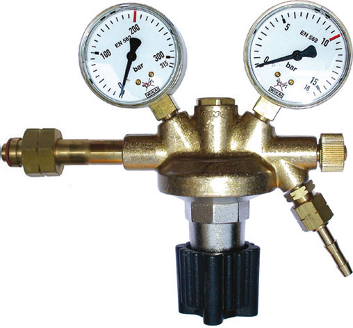 Corpo stampato con parte superiore in ottone massiccio e parte inferiore in pressofusione di zinco. Manometri di precisione. Manopola di regolazione della pressione in materiale sintetico e regolazione supplementare del passaggio del gas.