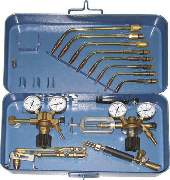 Composta di: 1 Impugnatura universale con attacco Ø mm 17, Art. 3200 GA. 8 Lance per saldare da mm 0,5 a 25, Art. 3200 GBx1 a 8. 1 Dispositivo per tagliare da mm 3 a 100 con carrello e guida, Art. 3200 GC. 1 Riduttore per ossigeno, Art. 3140 GE. 1 Riduttore per acetilene, Art. 3140 GA. In robusta cassetta lamiera smaltata.