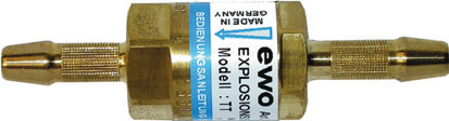 In ottone. Contro ritorni di fiamma, per la massima sicurezza. Approvate dall'Ente di sicurezza tedesco, secondo le norme DIN 8521. Si inseriscono fra il cannello e il riduttore della bombola. Con 2 attacchi portagomma. Per tubi gomma.