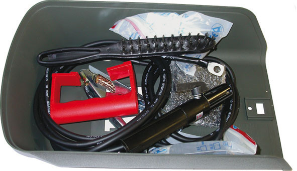 Composizione: 1 pinza per elettrodi - A 150 completa di 3 m cavo flessibile mm² 16 2 connettori Art. 3283x25 1 morsetto di massa completo di 2 m cavo flessibile mm² 10 1 martellina saldatori con spazzola 1 schermo di protezione 1 vetro protettivo trasparente mm 75x98 1 vetro protettivo inattinico colorato mm 75x98 L’assortimento completo.