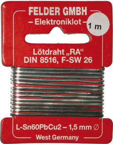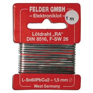 Filo saldante con disossidante interno DIN EN 29453 (DIN 8516). Per saldare rapidamente e tenacemente a stagno e a piombo senza acidi o disossidanti, anche in campo elettrico ed elettronico. Temperatura di fusione 183 °C - 190 °C.