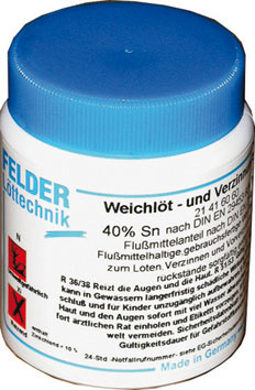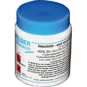 Pasta fluida per stagnare e per saldare a stagno senza disossidante DIN EN 29453. Lega 40% di stagno. Temperatura di fusione 183 °C - 235 °C. In contenitori di plastica.